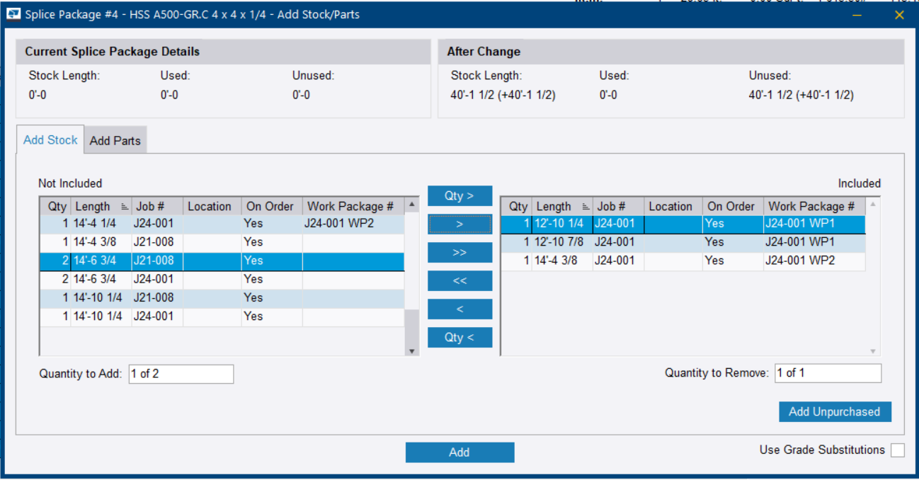 5. When you have added all the lengths that you need, click Add at the bottom of the Splice Package - Add Stock/Parts dialog.