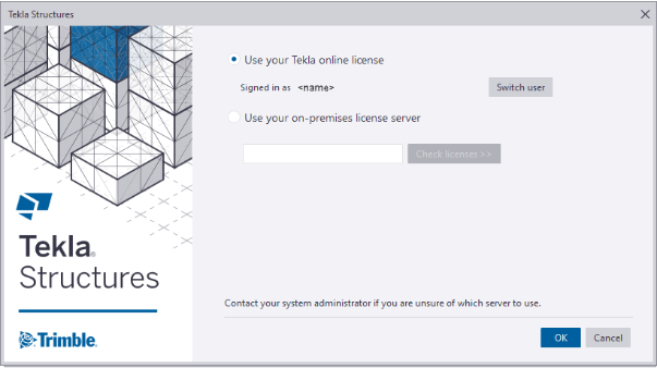 Tekla Structures must be connected to the Tekla on-premises license server.