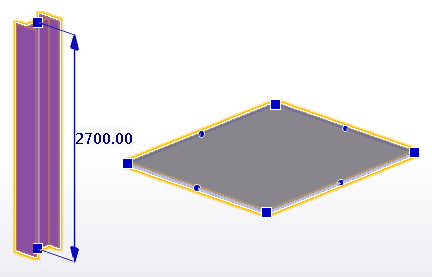 If Direct modification is on, Tekla Structures displays the direct modification handles for the reference points, corners, segments, and segment midpoints of the selected part. These handles are blue.
