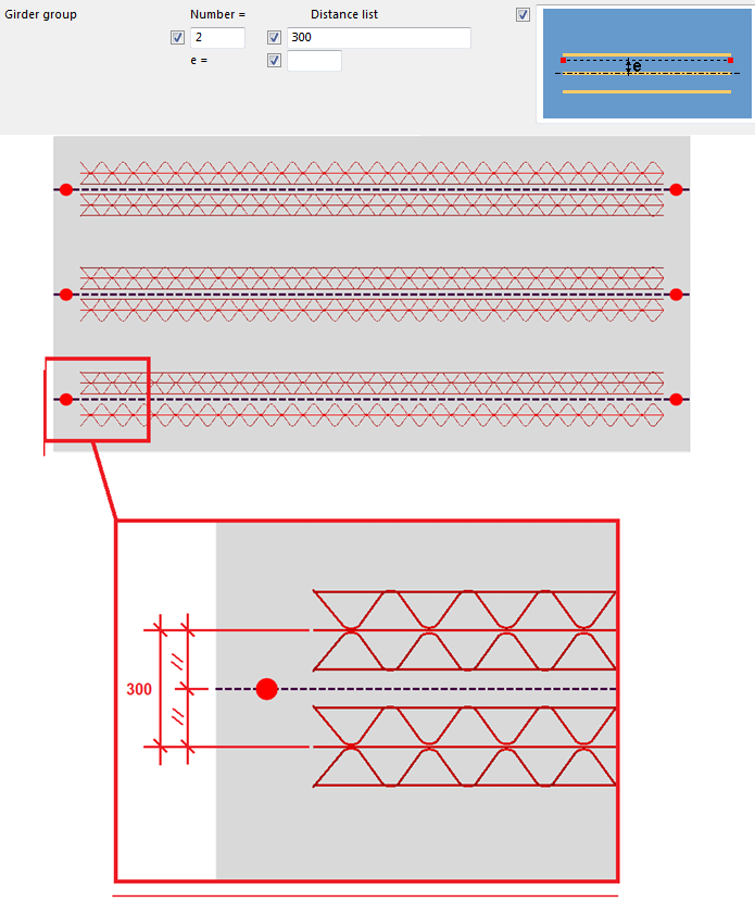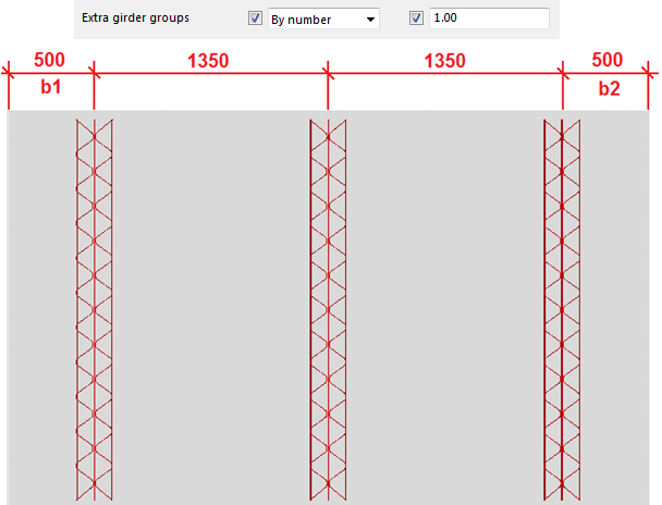 Extra girder groups is set to By number: Additional girder groups are created based on the entered number. Distances between the groups are equally divided.