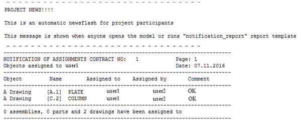 Example of the notification report containing list of drawing assignments: