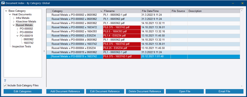 Index, you can filter the heat documents by supplier, PO number, and heat number and view the