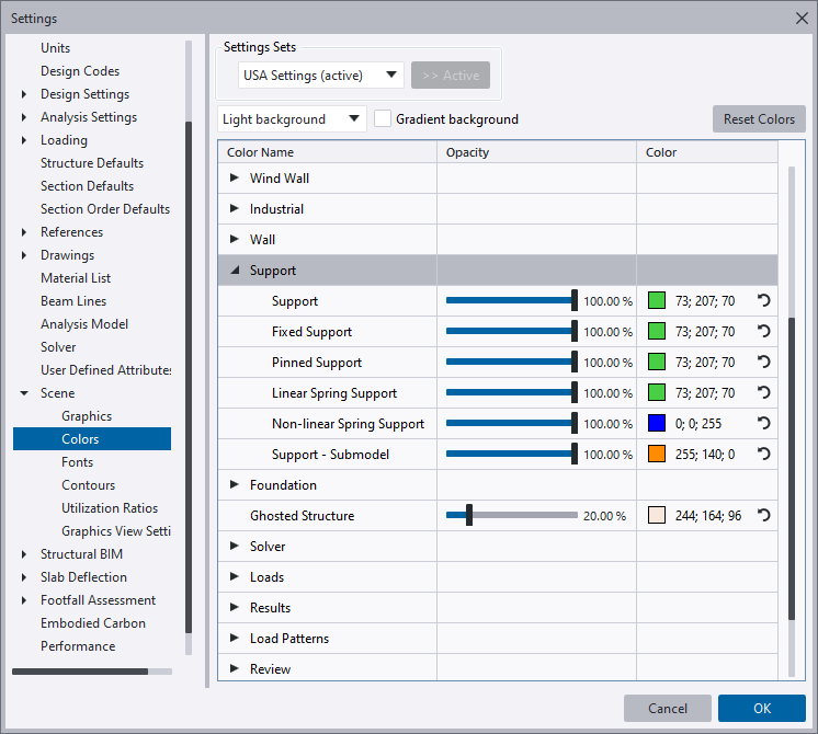 To differentiate between support types, you can configure distinct colors for fixed, pinned, linear spring, and non-linear spring supports as follows: