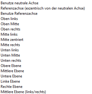Definiert die Position des Statikteils relativ zum entsprechenden physischen Teil. Die Position der Statikachse eines Teils legt fest, wo das Teil mit den anderen Teilen zusammentrifft und wo Tekla Structures Knoten in Statikmodellen erstellt. Die Optionen sind: