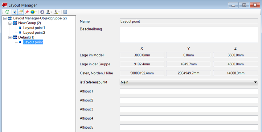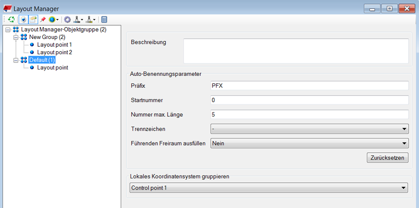 Fügen Sie in Layout Manager den Absteckpunkt zu einer Gruppe hinzu. Wählen Sie den selbst erstellten Basispunkt (Festpunkt 1) als Lokales Koordinatensystem gruppieren der Gruppe aus.