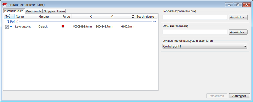 Die X-, Y- und Z-Koordinaten im Export-Dialogfeld sind die Koordinaten (Osten, Norden, Höhe bzw. X, Y, Z), die Sie in den Punkteigenschaften in Layout Manager einsehen können. Diese Koordinaten werden exportiert.