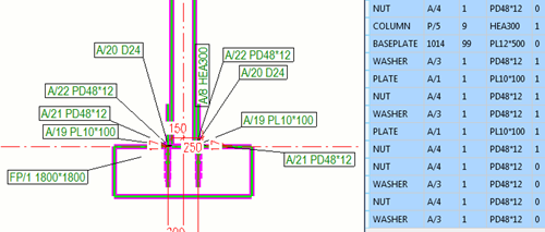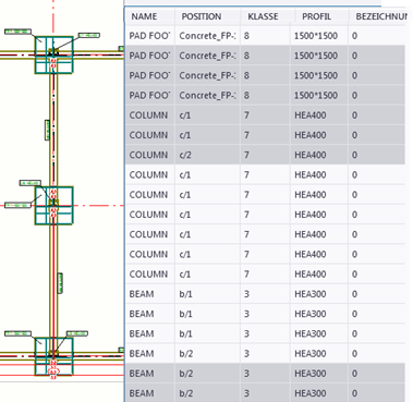 Wählen Sie Objekte in der Zeichnung aus, und heben Sie sie hervor. Die in der Zeichnung ausgewählten Teile werden in der Liste hervorgehoben: