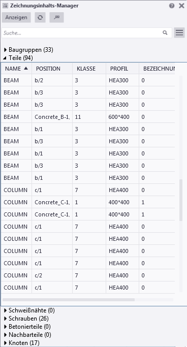 im Seitenbereich klicken. Klicken Sie dann auf Anzeigen, um die Liste Zeichnungsinhalts-Manager zu füllen. Wenn Sie nicht alle Bauobjekte auflisten möchten, grenzen Sie Ihre Auswahl ein, indem Sie bestimmte Zeichnungsansichten, Zeichnungsbereiche oder mehrere Objekte auswählen und dann auf Anzeigen klicken.