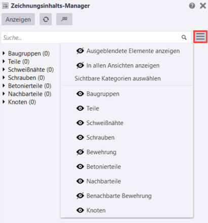 | Die in der Zeichnung ausgeblendeten Bauobjekte in der Zeichnungsinhalts-Manager-Liste einblenden | Klicken Sie auf Ausgeblendete Elemente anzeigen im Menü Optionen. |