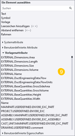 (9) Benutzerdefinierte Attribute, Vorlagenattribute und benutzerdefinierte Eigenschaften können jetzt aus einer Liste ausgewählt werden, damit Sie sich nicht mehr bei der Eingabe die genauen Namen im Kopf haben müssen.