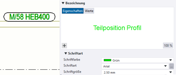 Die Benutzeroberfläche des Eigenschaftenbereichs der Zeichnung entspricht der des Modellierungsmodus. Er dient beim Umgang mit Eigenschaften von Zeichnungsobjekten in Tekla Structures einer modernen, leistungsstarken Methode. Der Eigenschaftenbereich der Zeichnung bietet einen reibungslosen Arbeitsablauf beim Erstellen und Ändern von Zeichnungsobjekten, beim Speichern und Laden von Zeichnungsobjekteigenschaften und beim Kopieren von Eigenschaften zwischen Objekten. Mit dem Eigenschaftenbereich der Zeichnung wird auch ein grafischer Editor zum Bearbeiten von Maßbezeichnungen, Ansichtsüberschriften, assoziative Anmerkungen und den meisten Bezeichnungstypen eingeführt.