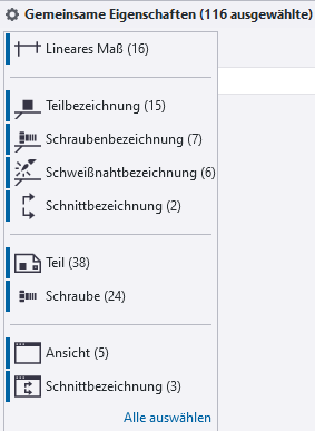 Ähnlich wie im Eigenschaftenbereich des Modells können die Eigenschaften eines Zeichnungsobjekttyps oder die allgemeinen Zeichnungseigenschaften von mehreren, ähnliche Objekttypen gleichzeitig anzeigen und ändern.