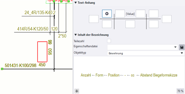 Mit dem neuen Eigenschaftenbereich der Zeichnung von Tekla Structures 2023 wird auch ein grafischer Editor zum Bearbeiten von Zeichnungsanmerkungen wie Maßbezeichnungen, Ansichtsüberschriften, assoziative Anmerkungen und die meisten Bezeichnungstypen eingeführt. Das Ergebnis in den Bezeichnungen können Sie beim Erstellen anzeigen. Dadurch gestaltet sich die Bearbeitung der Bezeichnungen sehr viel einfacher.