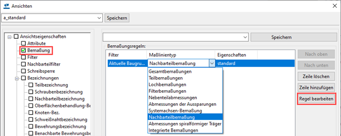 Im Bereich Bemaßung können Sie mit Zeile hinzufügen Regeln hinzufügen. Wählen Sie anschließend in der Spalte Maßlinientyp aus, welche Bemaßungsregeln Sie verwenden möchten, und geben Sie die gewünschte Bemaßungsregeleigenschaftendatei an.