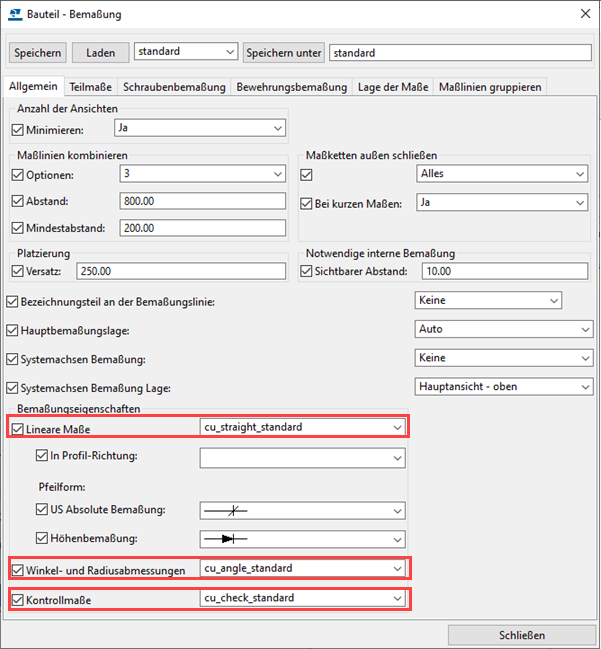 Wenn Sie Integrierte Bemaßungen auswählen, wird das Dialogfeld Bemaßungseigenschaften angezeigt. Nehmen Sie die Änderungen an den Einstellungen auf den Registerkarten vor, und speichern Sie die Eigenschaftendatei über Speichern unter unter einem eindeutigen Namen. Sie können hier auch Bemaßungseigenschaften laden.