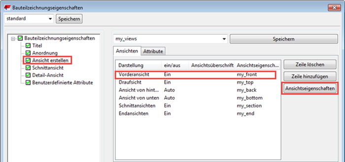 - Wenn Sie in den Zeichnungseigenschaften auf die Option Ansicht erstellen in der Optionsstruktur klicken, können Sie die zu erstellenden Ansichten und die zu verwendenden Ansichtseigenschaften auswählen.