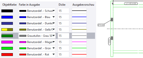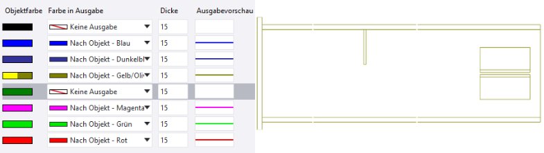 Die ausgewählte Farbe wird der Zeile als Ausgabefarbe hinzugefügt. Die Linienstärke wird aus der Zeile Standard übernommen, kann jedoch angepasst werden. In der Vorschau werden die neue Farbe und die Linienstärke angezeigt.