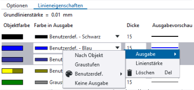 . Dadurch werden alle in der Zeichnungsvorschau verwendeten Objektfarben als den Linieneigenschaften der Registerkarte Linieneigenschaften hinzugefügt. Ist die Farbe bereits vorhanden, wird sie nicht erneut hinzugefügt. Vergewissern Sie sich, dass bei den einzelnen Zeilen Farbe in Ausgabe auf Nach Objekt eingestellt ist. Die Linienstärke aus der Zeile Standard wird auf alle Zeilen übertragen, kann jedoch angepasst werden.