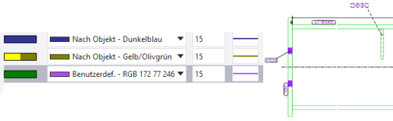 Der Registerkarte Linieneigenschaften wird eine neue Zeile für die Linieneigenschaft mit der spezifizierten Farbe hinzugefügt. Die Linienstärke wird aus der Zeile Standard übernommen, kann jedoch angepasst werden. Ist die Farbe bereits vorhanden, wird sie nicht erneut hinzugefügt.