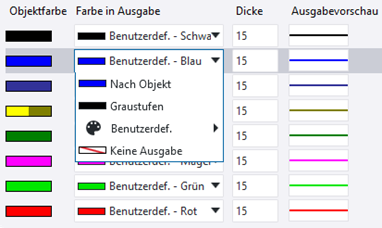 In den Linieneigenschaften können Sie einer Objektfarbe eine benutzerdefinierte Farbe als Ausgabefarbe zuweisen.
