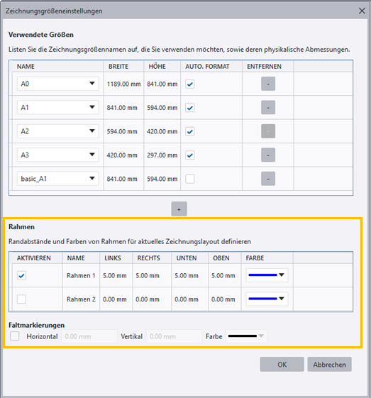beim Definieren von Farben für Zeichnungsrahmen und Faltmarkierungen in Zeichnungslayout-Editor