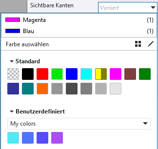 . Die Farbpalette wird auch angezeigt, wenn Sie B.-def. als Ausgabefarboption auswählen. Hier können Sie Farben aus den verfügbaren Paletten auswählen. Zum Öffnen des Modus für benutzerdefinierte Farbbearbeitung klicken Sie oben auf die Schaltfläche