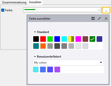 Um einem Zeichnungsobjekt eine benutzerdefinierte Farbe zuzuweisen, klicken Sie auf eine Farbeinstellung in einem Eigenschaftenbereich für Zeichnungsobjekte oder auf die Auswahlschaltfläche