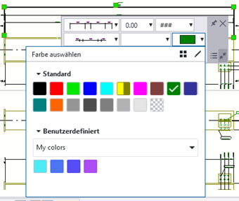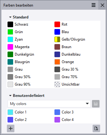 Im neuen Dialogfeld Farbpalette können Sie eine zu verwendende Standard- oder benutzerdefinierte Farbe auswählen, im Bearbeitungsmodus dann auch einen Satz benutzerdefinierter Farben definieren und in einer Eigenschaftendatei speichern, um diese beispielsweise problemlos in einem bestimmten Projekt erneut zu verwenden oder freizugeben. Eigenschaftendateien für Farben können unter allen Standarddateipfaden wie Projekt- oder Firmenordnern abgelegt werden. Die gespeicherten benutzerdefinierten Farbpaletten sind überall dort verfügbar, wo Sie die Farben ändern möchten: in allen Zeichnungsobjekten, auf allen Ebenen der Zeichnungseigenschaften, in Linieneigenschaften beim Drucken und für Vorlagenobjekte im Vorlageneditor.