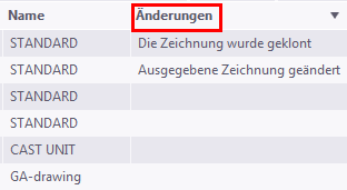 Das Attribut CHANGES stellt die in einer Zeichnung vorgenommenen Änderungen dar, beispielsweise ob eine Zeichnung ausgegeben oder Teile geändert wurden. Dieses Attribut kann zum Hinzufügen von Informationen über Änderungen in Zeichnungslisten verwendet werden. Im Dokument-Manager finden wird hierfür zudem die Spalte Änderungen.
