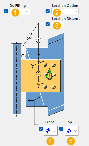 Wählen Sie aus, ob die Fläche der Befestigung am Hauptteil geändert werden soll. Standardmäßig ist die Lasche mit dem Steg des Hauptteils verbunden. Wenn das Nebenteil eine steile Neigung aufweist, wird die Lasche mit dem Flansch des Hauptteils verbunden. |