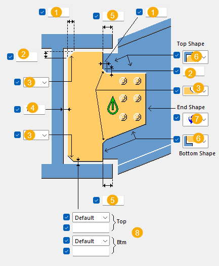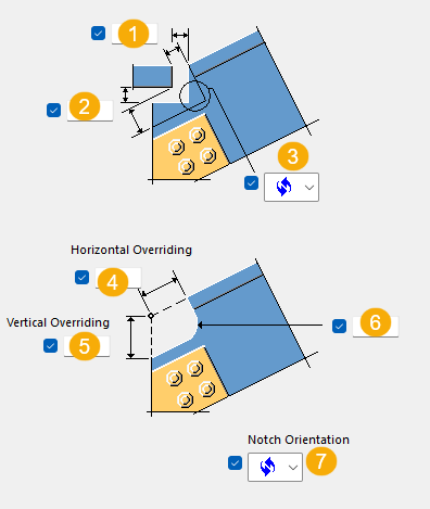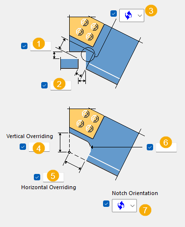 Auf den Registerkarten Obere Ausklinkung und Untere Ausklinkung definieren Sie die Einstellungen und Abmessungen von Ausklinkungen.
