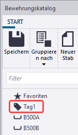 Wenn Sie Definitionen zu Favoriten hinzugefügt haben, wird das Dialogfeld Bewehrungskatalog mit der ausgewählten Gruppe der Favoriten geöffnet.