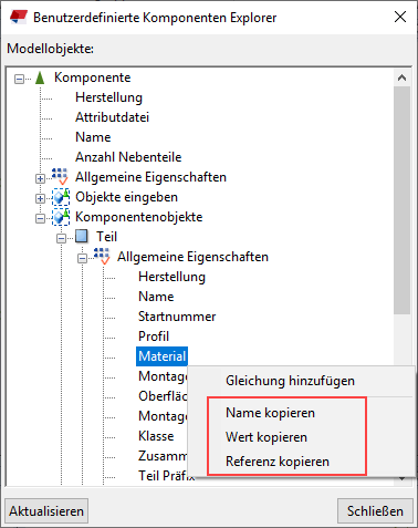 Sie können Eigenschaften wie Namen und Werte aus anderen Objekten kopieren und zum Bestimmen der Eigenschaften einer benutzerdefinierten Komponente verwenden. Sie können auch Referenzen von Eigenschaften kopieren. Die Verknüpfung ist dynamisch, d. h., bei einer Änderung der Eigenschaft ändert sich auch die Referenz. Sie können zum Beispiel eine Trägerlängenreferenz in Variablenformeln verwenden. Selbst wenn sich die Länge ändert, wird stets der korrekte Wert in Berechnungen verwendet.