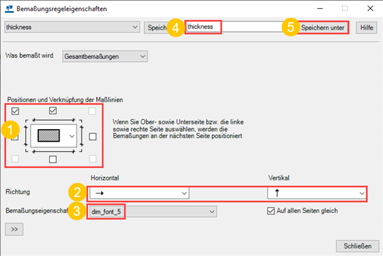 Wählen Sie im Bereich Bemaßung den Eintrag thickness in der Spalte Eigenschaften als Eigenschaftsdatei für die Gesamtbemaßungsregel aus.