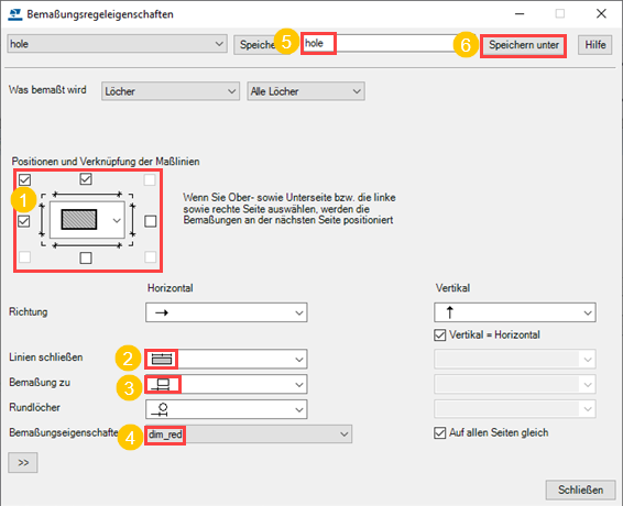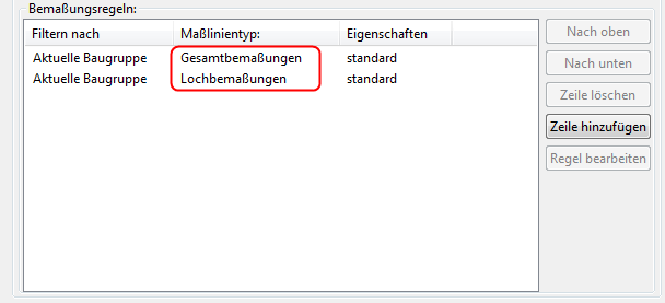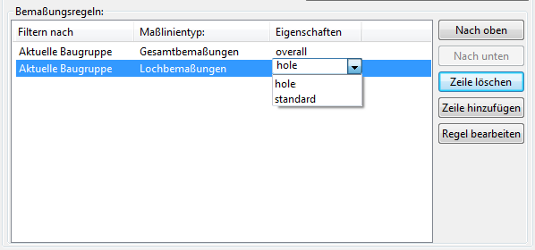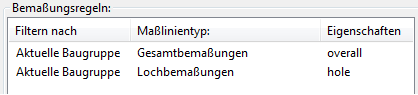 Wählen Sie für die Regel Gesamtbemaßungen die Eigenschaften overall und für die Regel Lochbemaßungen die Eigenschaften hole in der Spalte Eigenschaften aus.