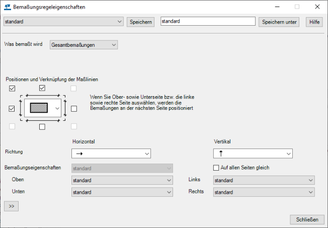 Wählen Sie unter Linien schließen die Einstellung aus, mit der Maßlinien bis zum anderen Ende des Bauteils verlängert werden.