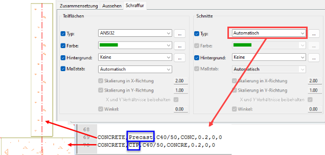 Ortbeton- und Fertigteilschraffuren verwenden unterschiedliche automatische Schraffuren abhängig von der Bauteil Bauart. Sie müssen die entsprechende Bauteil Bauart in den Betonteileigenschaften auswählen.