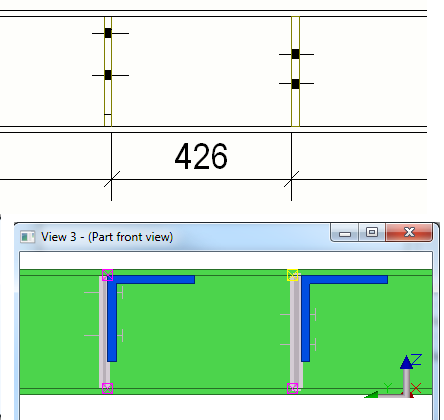Hinweis: Wenn Sie ein Blech von links nach rechts und ein anderes Blech von rechts nach links erstellt haben, bemaßt Tekla Structures die Bleche unterschiedlich. |