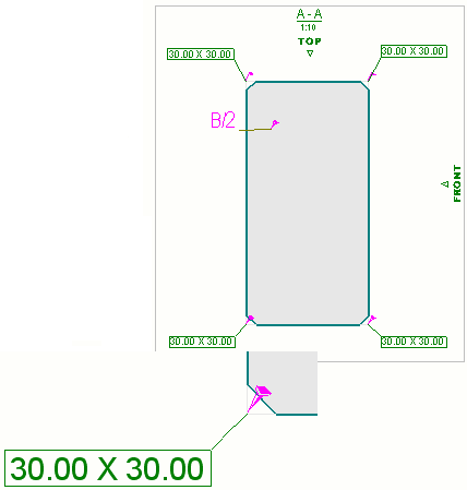 Beim zweiten Beispiel ist das Teil Darstellung auf Kontur und Eckschnitte in den Teileigenschaften auf sichtbar eingestellt. Die unsichtbare Farbe wird für Eckschnittlinien verwendet, damit sie in der Zeichnung beispielsweise zum Hinzufügen von assoziativen Anmerkungen eingeblendet und ausgewählt werden können. Dieser Darstellungstyp wird häufig für kleine Maßstäbe verwenden, bei denen kleine Eckschnitte nicht deutlich zu sehen sein müssen. Der in der unteren rechten Ecke des Bildes angezeigte Eckschnitt veranschaulicht, wie ein ausgewählter Eckschnitt aussieht.