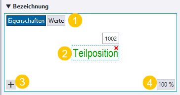 (1) Klicken Sie auf die Schaltfläche Eigenschaften oder Werte, um entweder den Namen oder den Wert der Eigenschaft im Editor anzuzeigen. Diese Schaltflächen sind beim Bearbeiten einer vorhandenen Bezeichnung verfügbar. (2) In der Vorschau der Bezeichnung werden die ihr hinzugefügten Elemente und deren ausgewählte Darstellung angezeigt. Sie können die Elemente an eine andere Stelle ziehen. Zum Löschen eines Elements klicken Sie in der oberen rechten Ecke des Elements auf die Löschschaltfläche (3) Neues Element. Mit der Schaltfläche Weitere Informationen zu Bezeichnungselementen finden Sie unter „Bezeichnungselemente in Zeichnungsbezeichnungen“. (4) Die Schaltfläche % zeigt den aktuellen Vergrößerungsgrad in der Vorschau an. Durch Scrollen mit der mittleren Maustaste können Sie ihn vergrößern oder verkleinern. Durch Klicken auf die Schaltfläche passen Sie die Größe optimal an. |