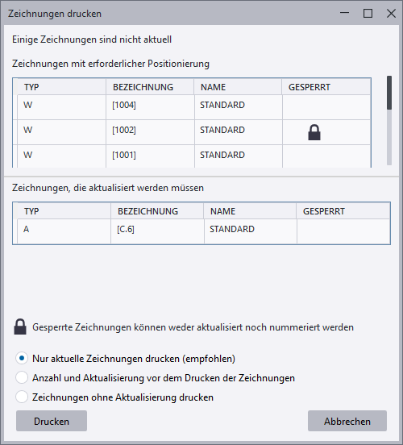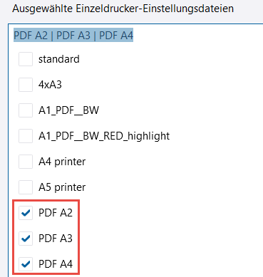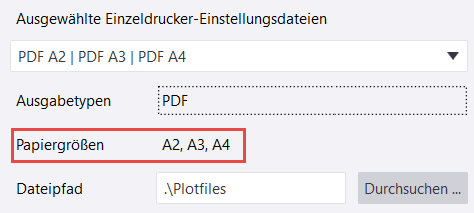 Wenn Sie einen Zeichnungssatz anhand der genannten einzelnen Druckereinstellungsdateien auf mehreren Druckern ausgeben, werden für alle A4-Zeichnungen .pdf-Dateien mit dem Präfix A4_ erzeugt, für alle A3-Zeichnungen Dateien mit dem Präfix A3_ und für alle A2-Zeichnungen .pdf-Dateien mit dem Präfix A2_.