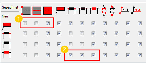 Die Objekte auf der linken Seite des Dialogfelds geben an, welche Objekte oder Objektelemente Tekla Structures nicht in den geschützten Bereichen platzieren kann. Siehe die Beschreibungen unten: