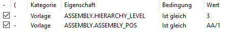 ASSEMBLY.HIERARCHY_LEVELals Eigenschaft ein, wählen Sie Gleich und geben Sie als Wert die gewünschte Baugruppenstufe an. -