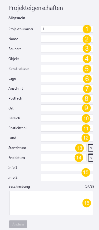 Im Laufe eines Projekts werden immer wieder Projekt- oder Auftragsdaten wie die Projektnummer und die Projektbezeichnung benötigt. Wenn Sie die Auftragsdaten zu Beginn eines Projekts aktualisieren, werden in Listen und Zeichnungen automatisch die richtigen Daten angezeigt. Alle Felder sind optional.