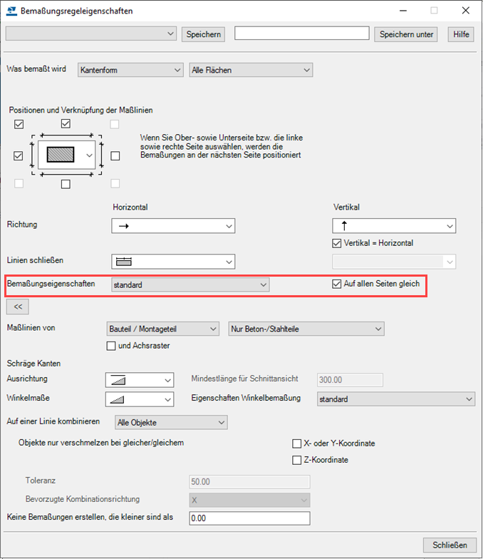 Zum Auswählen unterschiedlicher Maßlinieneigenschaften pro Seite deaktivieren Sie Auf allen Seiten gleich und wählen die Bemaßungseigenschaften aus den Listen aus.