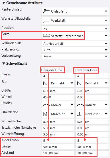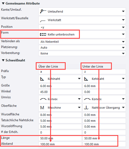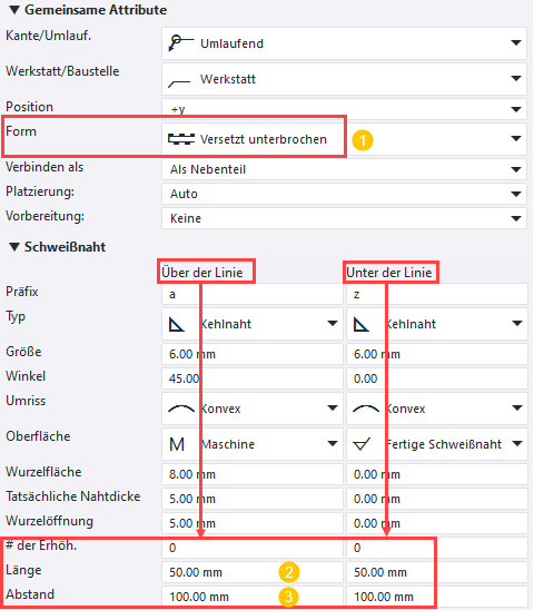 Im folgenden Beispiel wird eine versetzte, unterbrochene Schweißnaht dargestellt. Die Länge beträgt 50 und der Abstand 100.