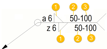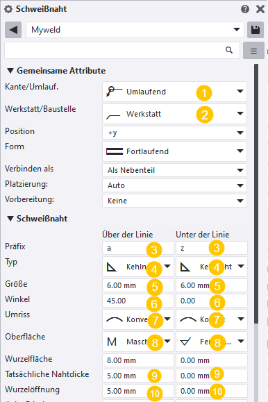In der ersten Abbildung des Beispiels werden die Eigenschaften von Zeichnungsschweißnahtbezeichnungen im Eigenschaftenbereich der Zeichnung dargestellt. Die Eigenschaften werden in der Abbildung nummeriert. In der zweite Abbildung wird die Zeichnungsschweißnahtbezeichnung mit Angabe Eigenschaften in der Bezeichnung dargestellt.