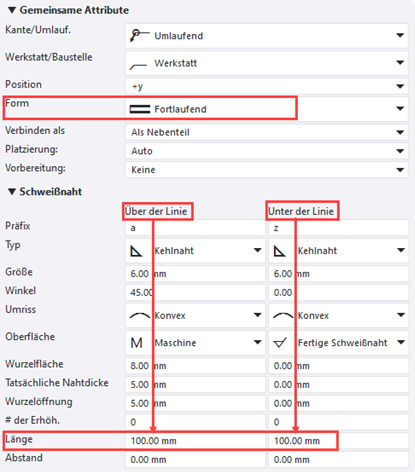 - Prüfen Sie die Werte auf Folgendes: Schweißnähte, Schweißnähte in Unterbaugruppen, Max. Schweißnahtgröße
