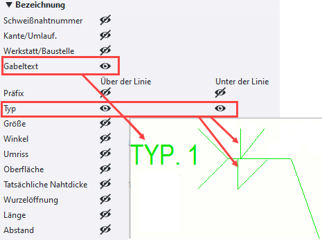 Beim zweiten Beispiel wurden alle Eigenschaften von Modellschweißnahtbezeichnungen außer Typ und Gabeltext ausgeblendet: