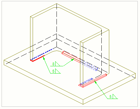 Das zweite Beispiel ist ein Querschnitt der Struktur. Die Schweißnähte links und in der Mitte sind mit Umrissen gezeichnet, die Schweißnaht rechts zeigt den Pfad an. Die Schweißnähte auf der rechten und linken Seite gehen um die Ecke des Teils. Die Schweißnähte sind mit manuellen Bemaßungen versehen.